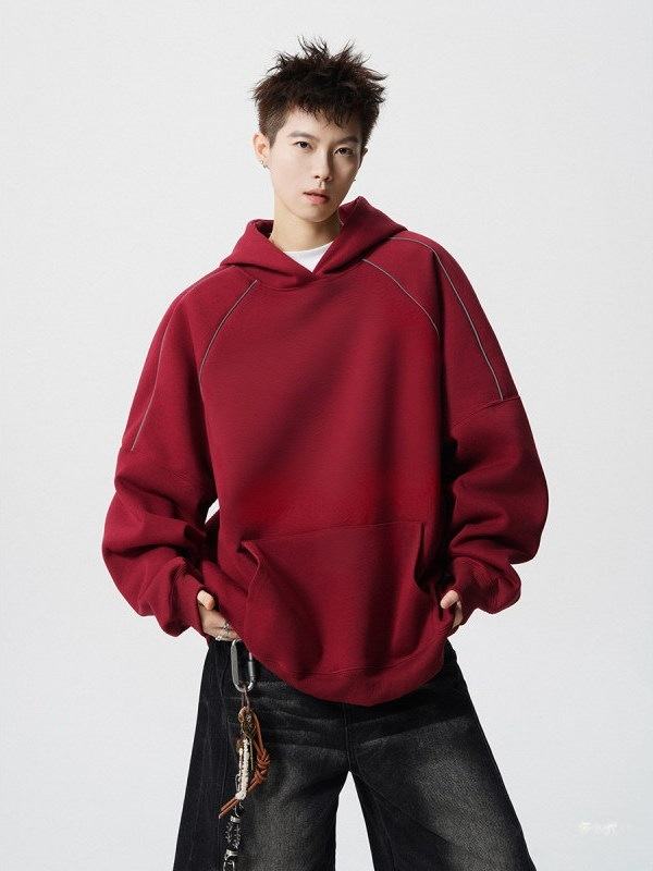 Wine Red Solid Reflective Strip Stitching 100% Cotton Loose Fit Autumn Men's Heavy Fleece Hoodie & Sweater Jacket