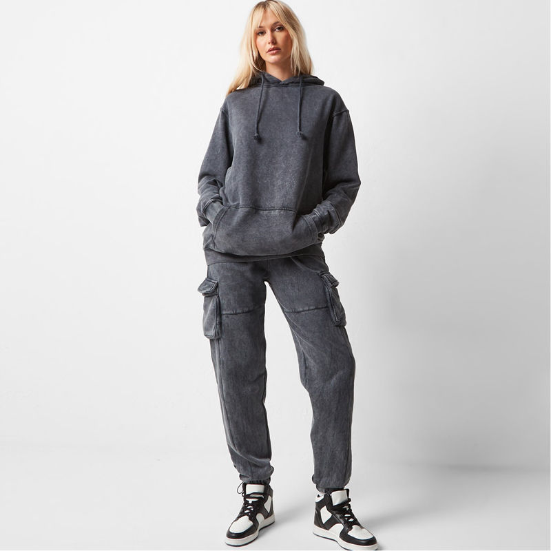 Winter Custom Manufacturer Acid Wash Unisex Sweatsuit 100% Cotton Men Women Washed Hoodie Cargo Joggers 2 Piece Set OEM Service