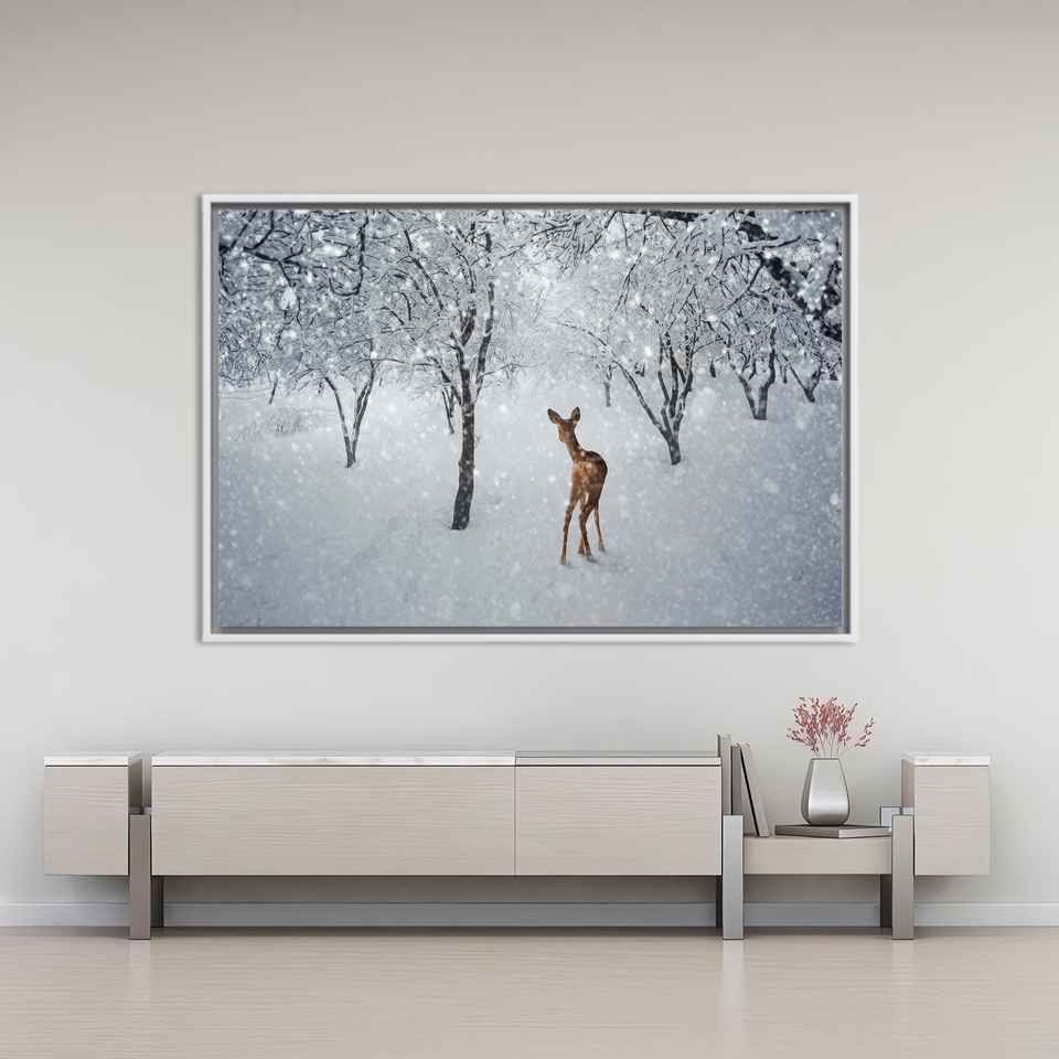 Winter Deer Canvas Print: Snowy Forest Tempered Glass Wall Art,WHITE FRAMED CANVAS