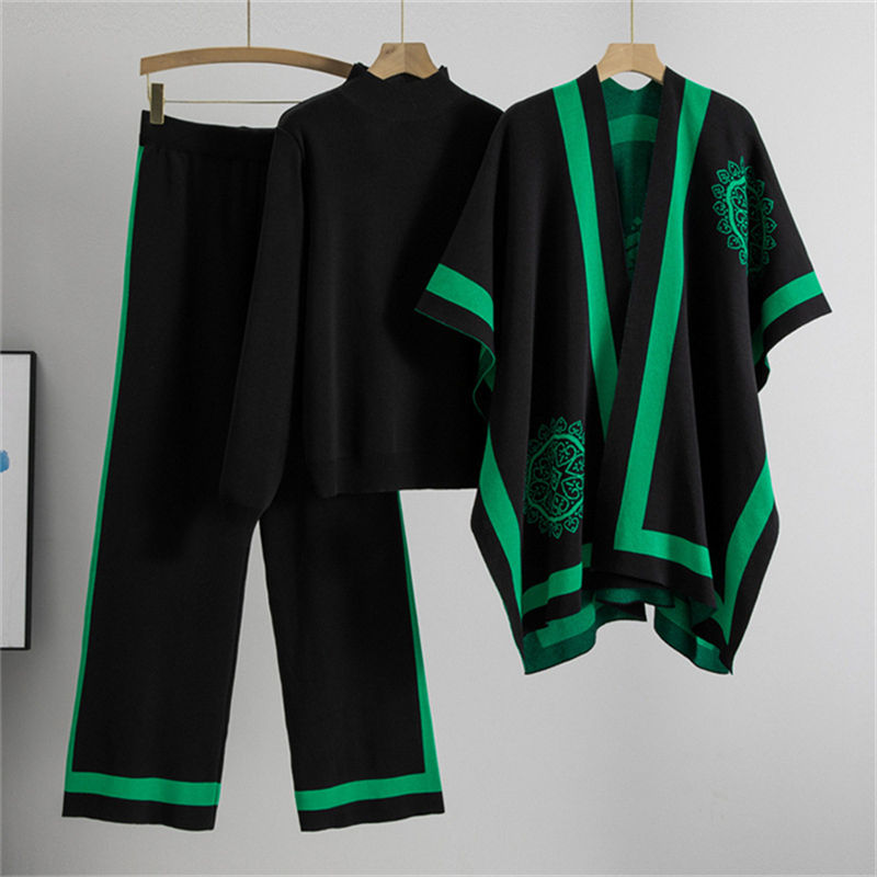 Winter Fashion ELEGANT Striped Digital Printing Breathable Knitting Muslim Women Three-Piece Set Stand Collar Woven Top Shawl