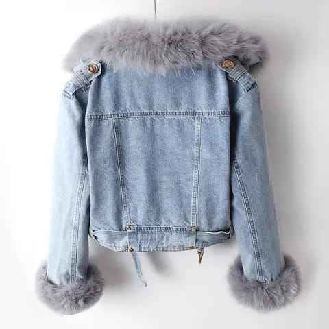 Winter Fur Collar Denim Jacket Women Loose Short Outerwear With Belt and Zipper
