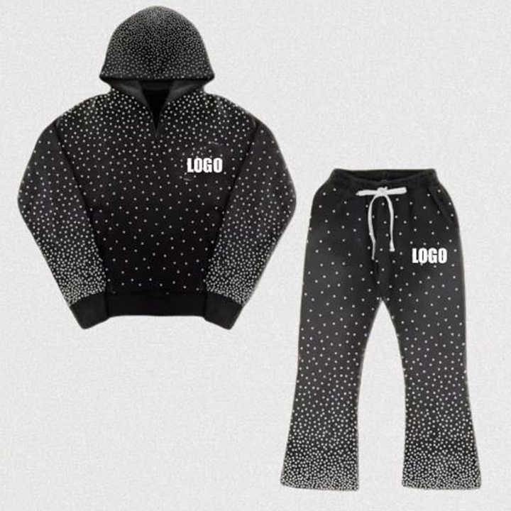 Winter Heavy Cotton Solid Printed Breathable Eco-Friendly Boxy Fit Hoodie Baggy Pants Allover Rhinestone Sweatsuit Custom