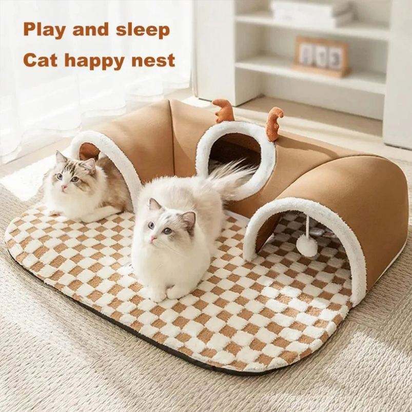 Winter Indoor Warm Plush Cat Bed with Reindeer Appearance Hide and Seek Cat Tunnel Play and Sleep Integrated Cat House Pet Nest