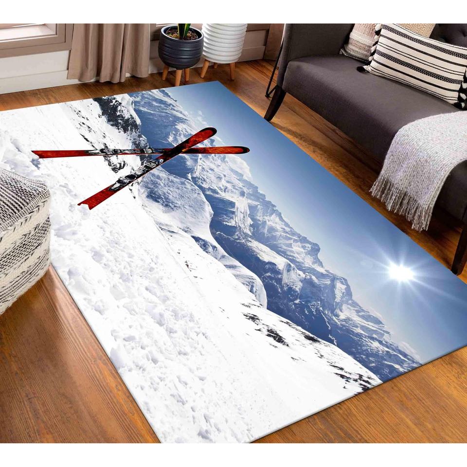 Winter Landscape Printed Rug: Ski Scene, Chenille Fabric, Anti-Slip, Machine Washable,Nonwoven Soft Rug