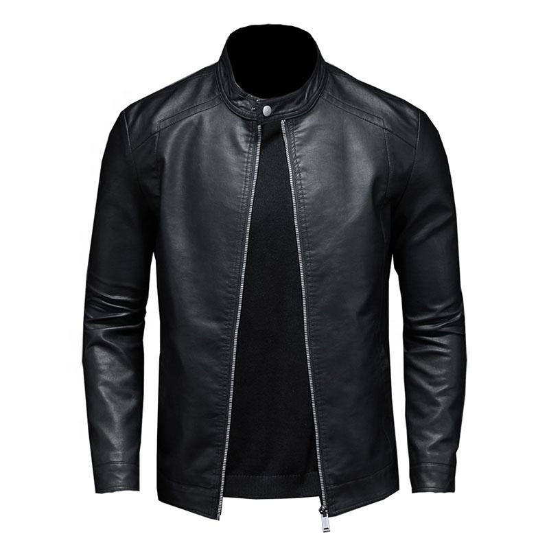 Winter Men's Canvas Leather Jacket Stand Collar Slim Fit Fashion Casual Motorcycle Biker Coat Front Logo