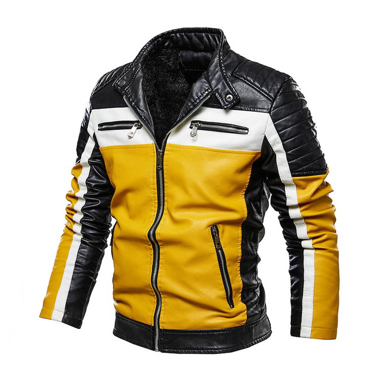 Winter Motorcycle Leather Jacket Men Pu Coats Stand Collar Fleece Lined Color Block Faux Leather Jackets Zipper Outwear