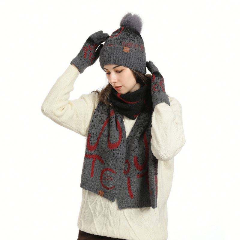Winter Needle Women's Jacquard Thickened Twist Pattern Adjustable Head Circumference Scarf Hat Gloves Three-Piece Set