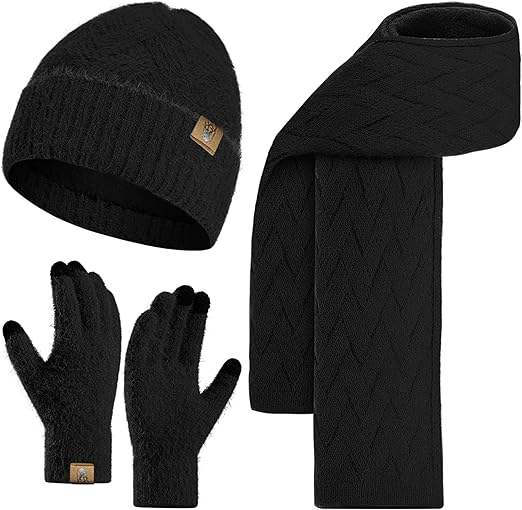 Winter Outdoor Long Beanie Hat Scarf Touch Screen Gloves Skull Cap & Neck Warmer Set for Women 100% Wool 1 Piece