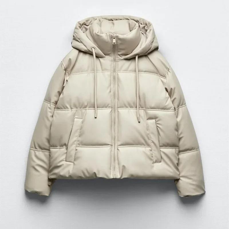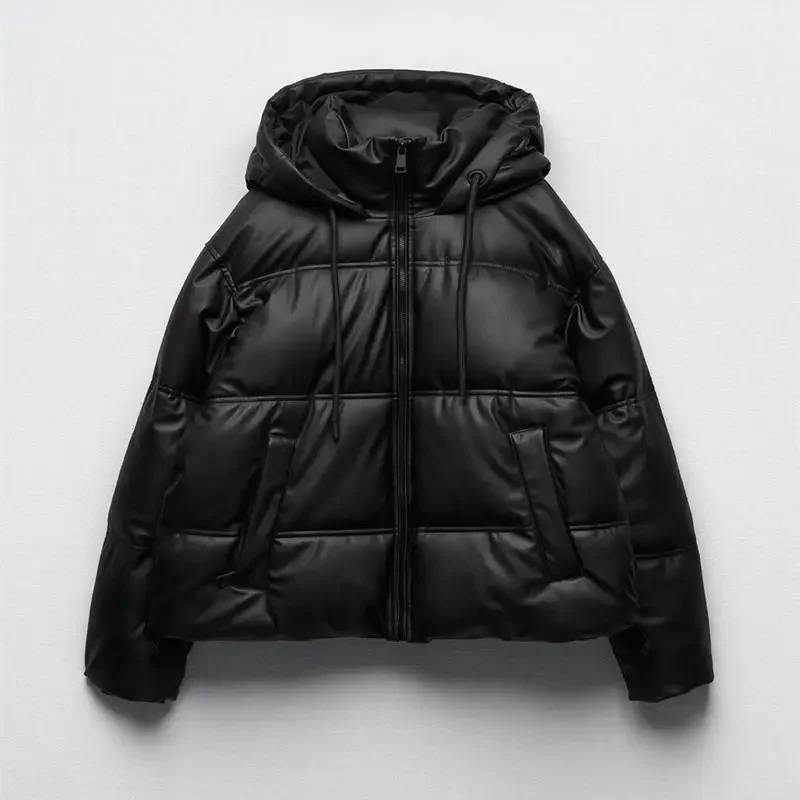 Winter Women Faux Leather Puffer Jacket 2024 Warm PU Snow Hooded Parka Female Casual Loose Coat Zipper Long Sleeve Overcoat