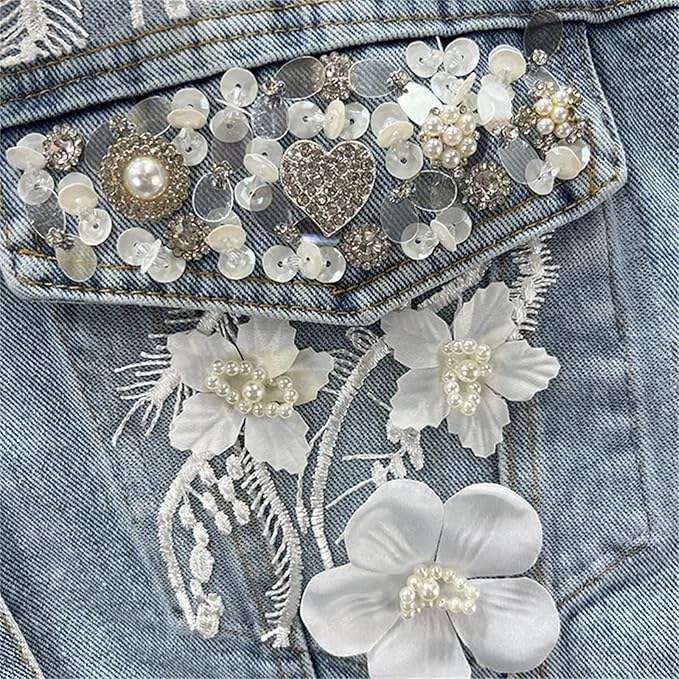 Winter Women's Denim Jacket with Leopard Print Embroidery Lace Flowers Floral Applique Beaded Design-Quick Dry & Eco-Friendly