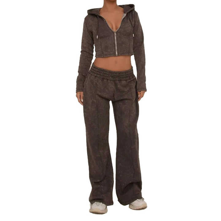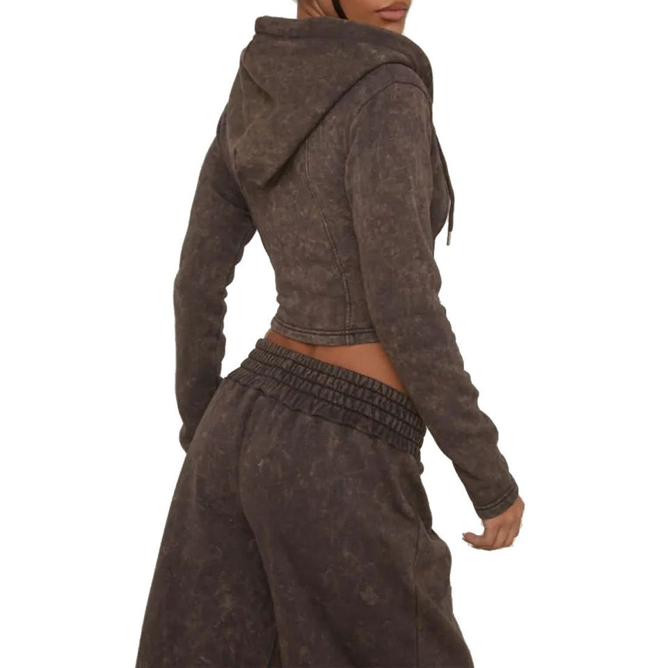 Winter Women's Ribbed 2-Piece Set With Long Sleeve Zip-Up Tops and High-Waist Leggings Acid Wash Cropped Tracksuits