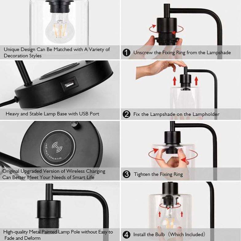 Wireless Mobile Phone Charging Bedside Lamp USB Charging Dimming Features Glass Table Lamp for US European Plastic Living Room