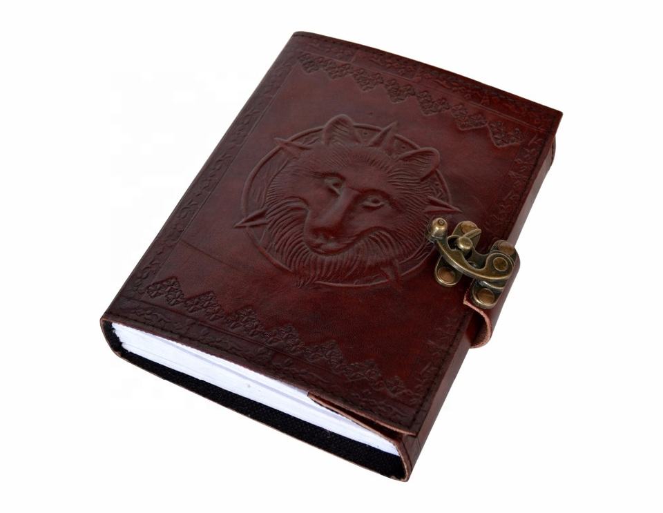 Wolf Face Embossed Handmade Genuine Leather Journal Custom A5 Notebook Planner Blank White Paper Diary With Antique Brass C-Lock