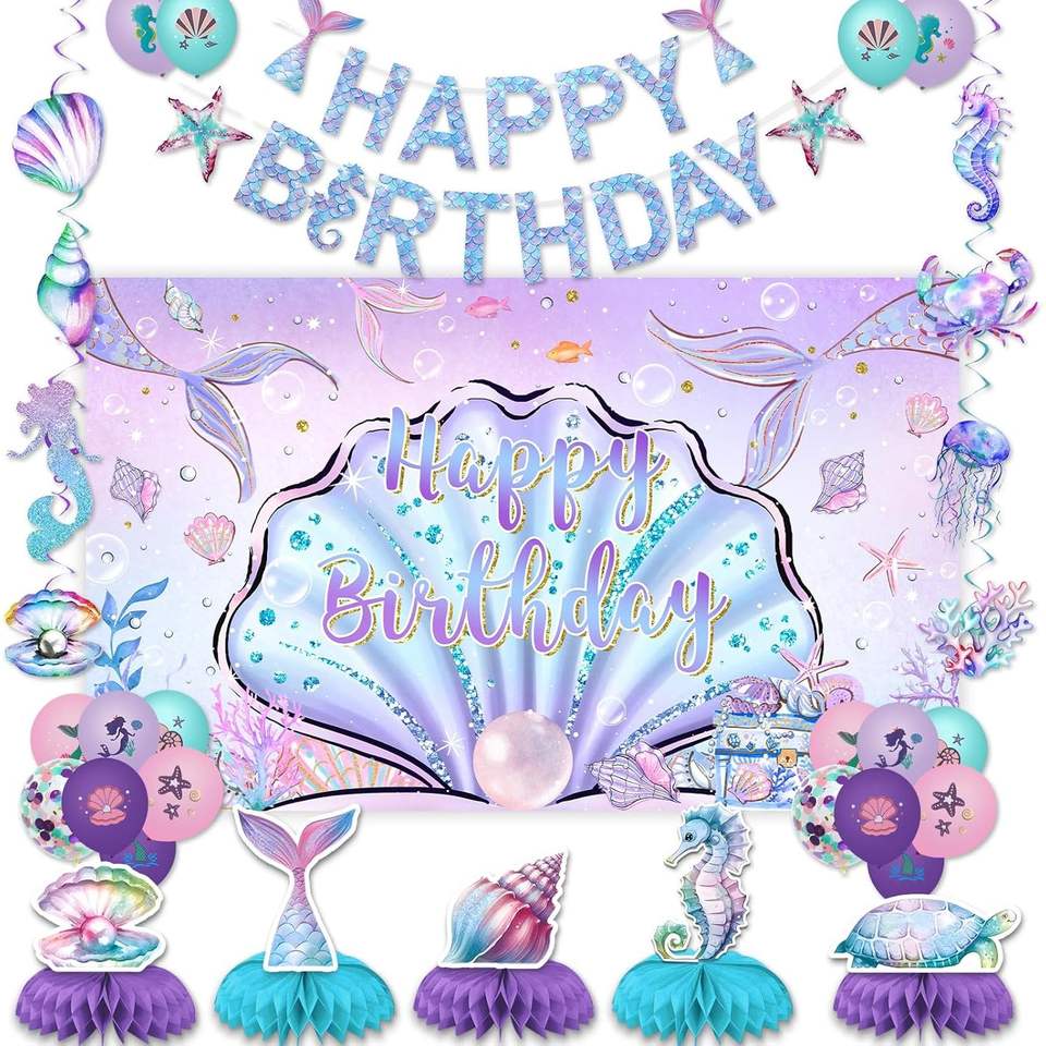 Wollmix Photo Booth Little Mermaid Birthday Decorations Set Princess Blue Sea Ocean Cake Topper Hanging Swirl Centerpieces Party