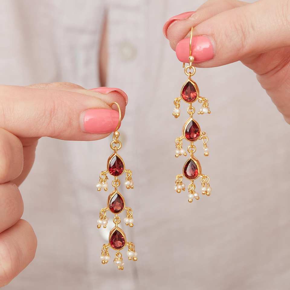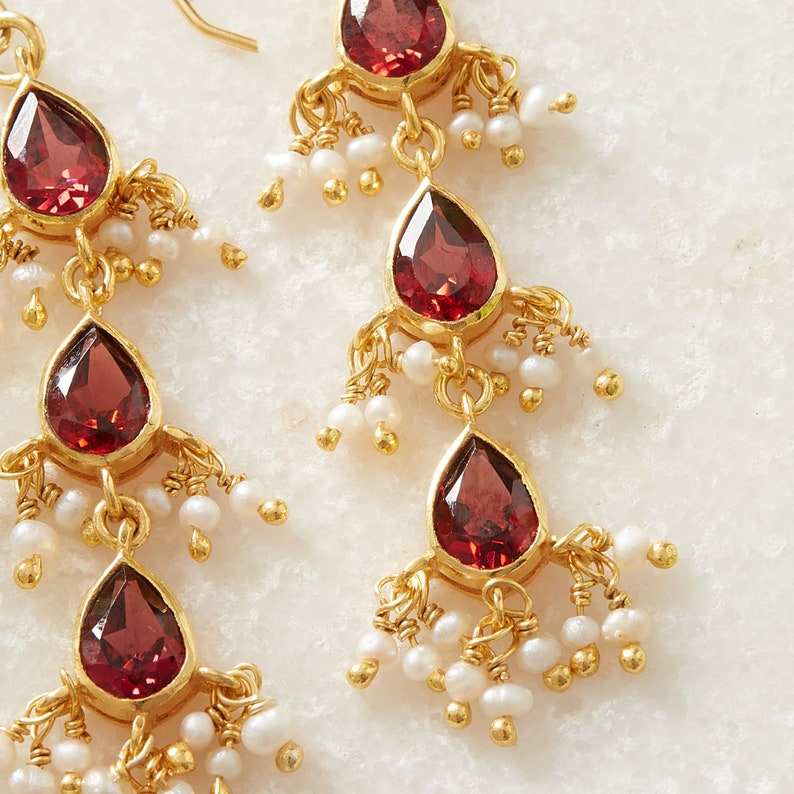 Woman's Fashion Natural Pear Cut Garnet Gemstone & Seed Pearl Stone Solid 925 Sterling Silver 18K Gold Plated Dangling Earrings