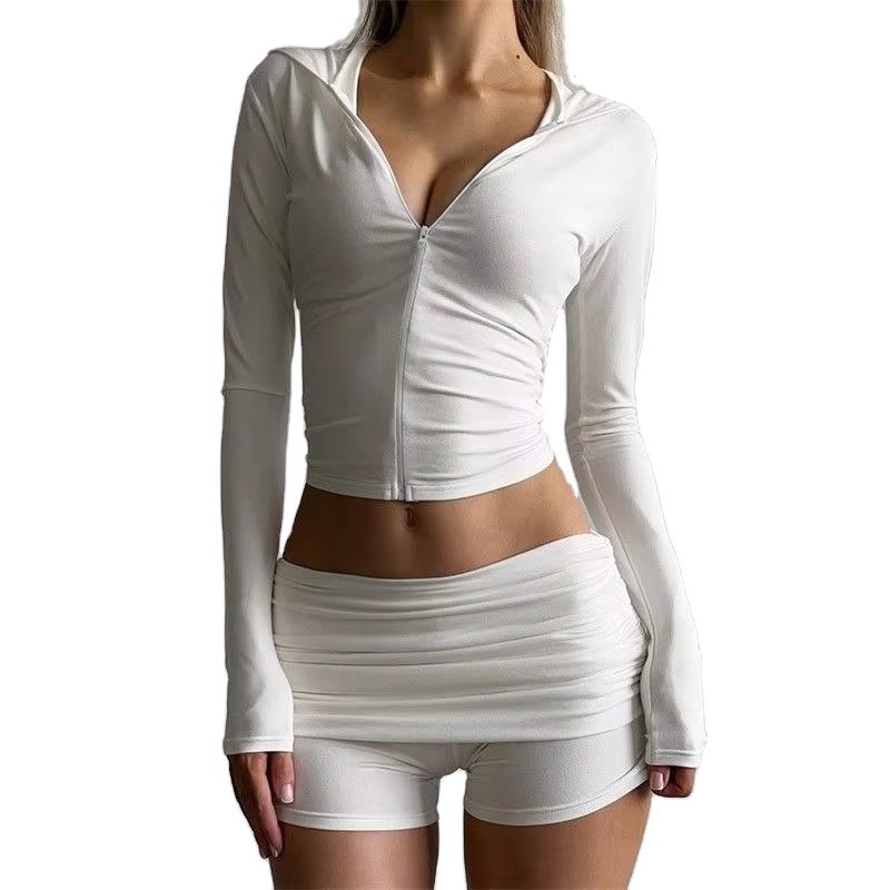 Women 2 Piece Set Zipper Hooded Top Pleated Above Knee Shorts Solid Color Long Sleeve Sportswear Winter Fashion