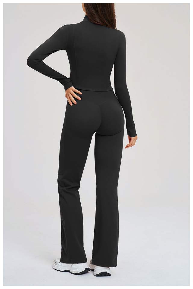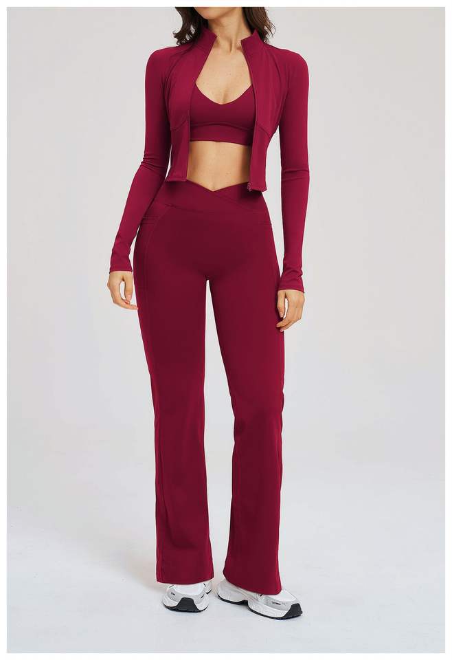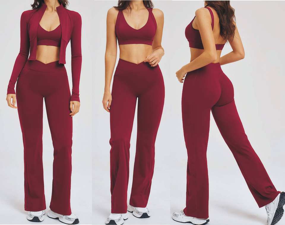 Women 3 Pcs Yoga Set High Waist Flared Leggings Sports Bra Zip Jacket Gym Workout Fitness Athletic Activewear Sportswear