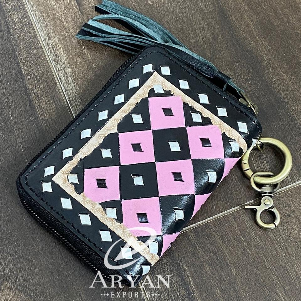 Product name:Hand Tooled Checkered Leather Zipper Coin Purse