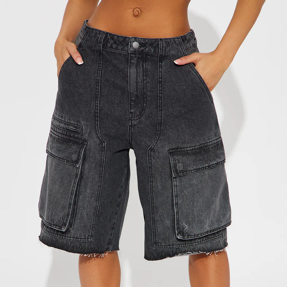Women Baggy Pockets Denim Shorts Loose Mid-Rise Cargo Long Jean Shorts Summer Wide Leg Raw Hem Carpenter Jorts Low MOQ Washed