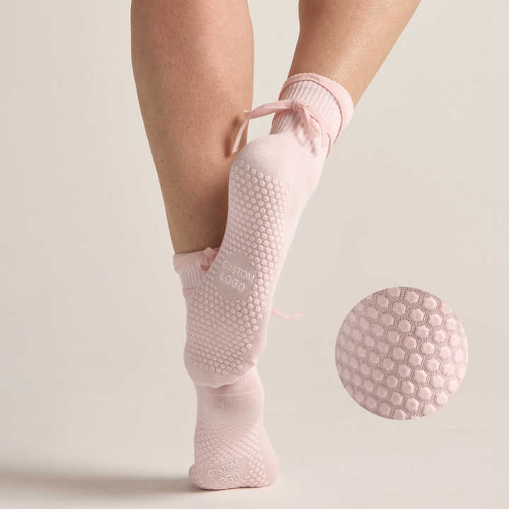 Women Ballet Yoga Pilates Style Grip Sock with Tie Up Strap and Custom Non Slip Dotted Sole, Comfortable Socks for Fitness Class