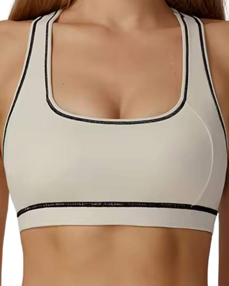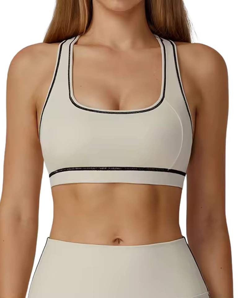 Women Beige Black Contrast Sports Bra And High Waist Leggings Set Stretch Yoga Fitness Gym Workout Wear Custom OEM Wholesale