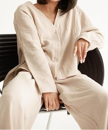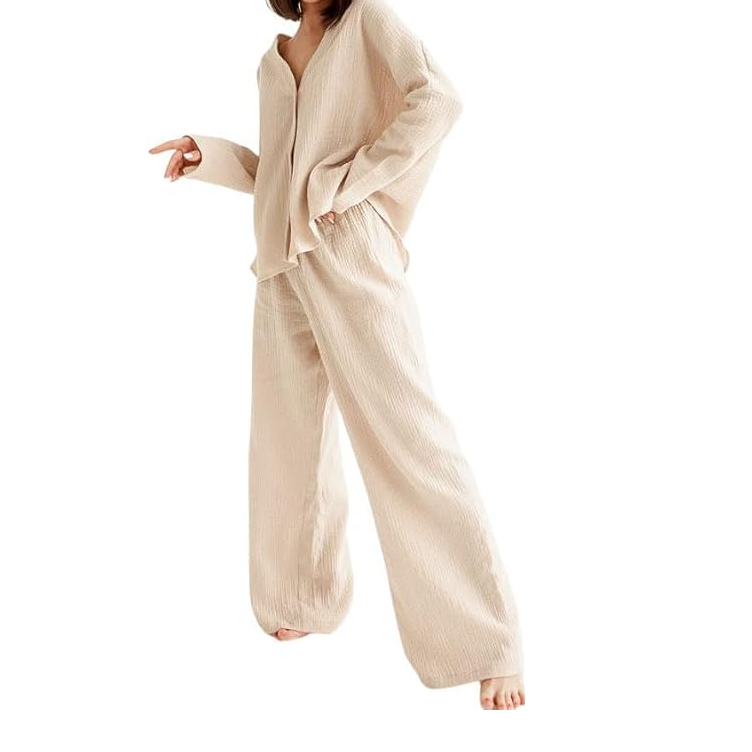 Women Beige Polyester Two-Piece Set Long Sleeve Loose Fit Shirt with Wide Leg Pants Casual Lounge Outfit