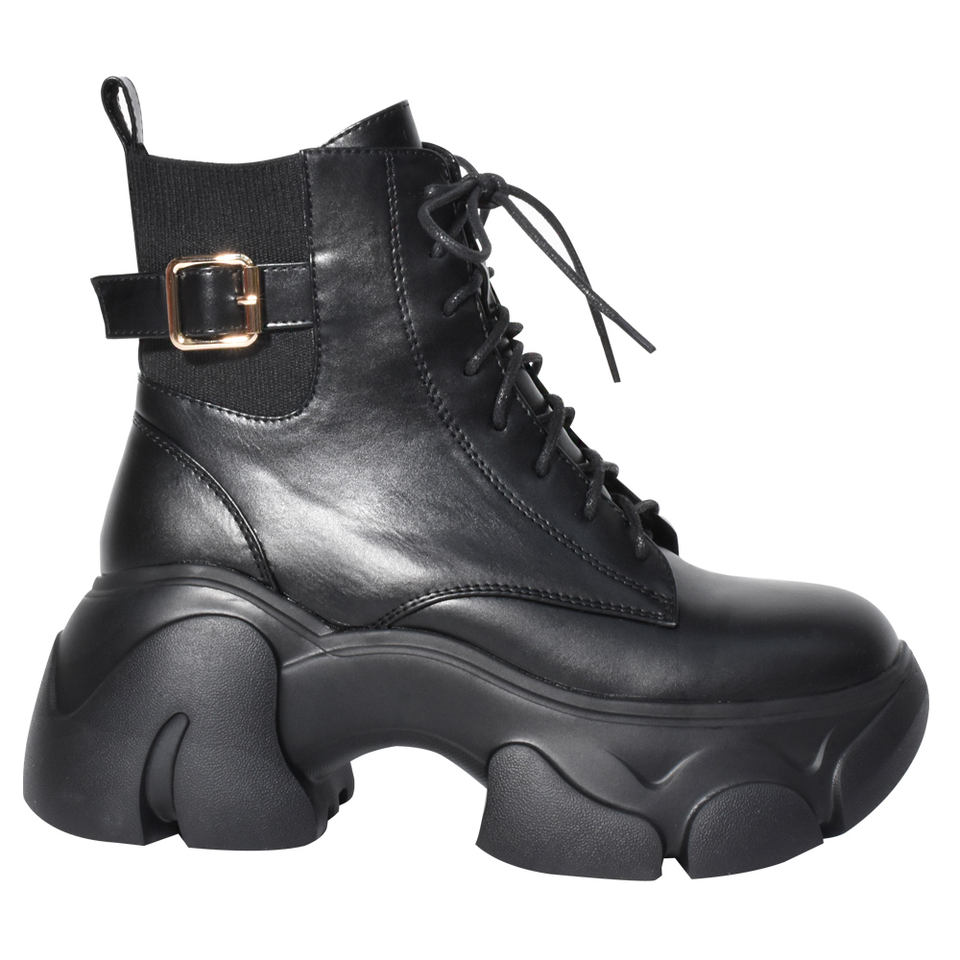 Women Black Lace-Up Platform Ankle Boots 8.5cm Chunky Heel Water-Repellent Stretch Genuine Leather Upper Padded Heel Lining Arch