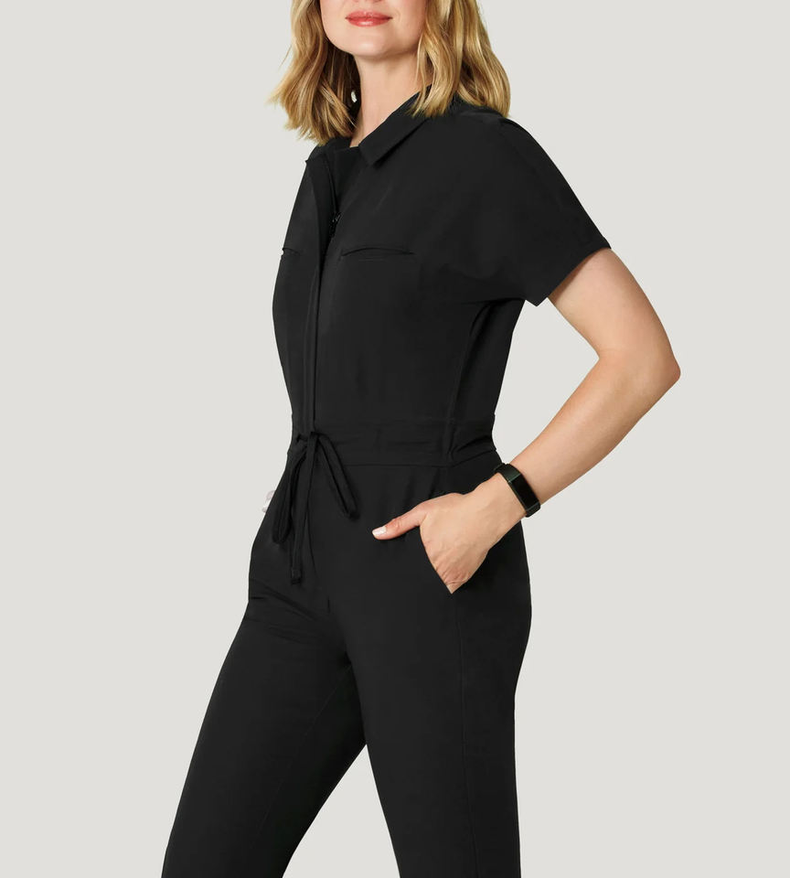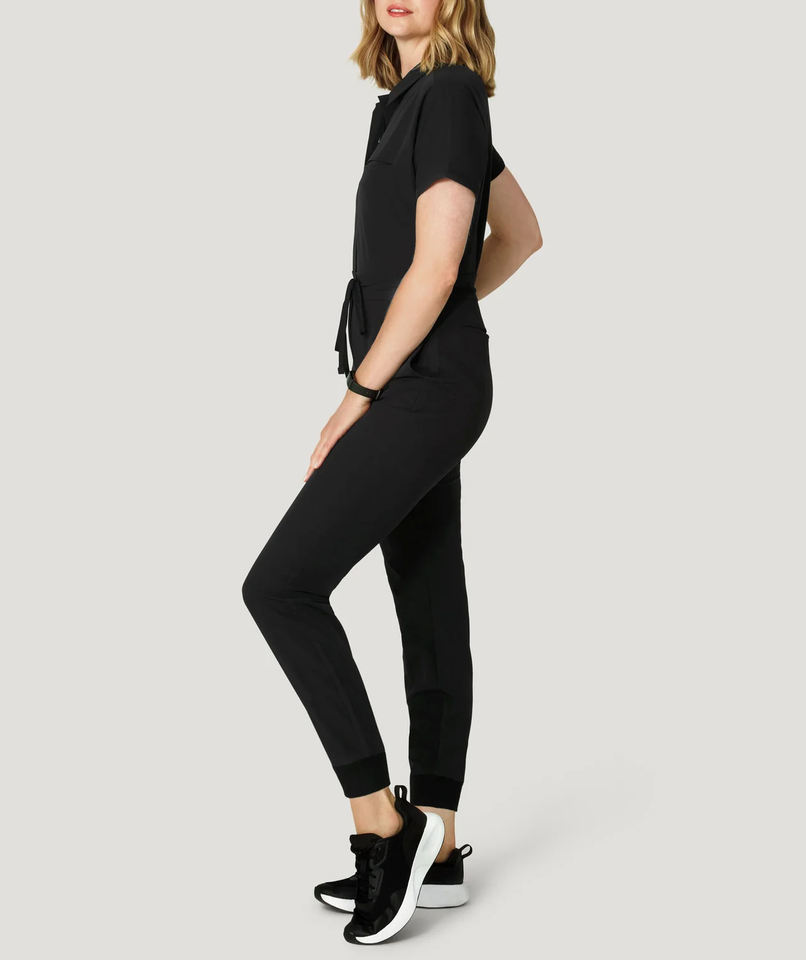 Women Black Medical Scrub Jumpsuit 4-Way Stretch Breathable Fabric Ribbed Elastic Ankle Cuffs Hospital Scrub Uniform Sets