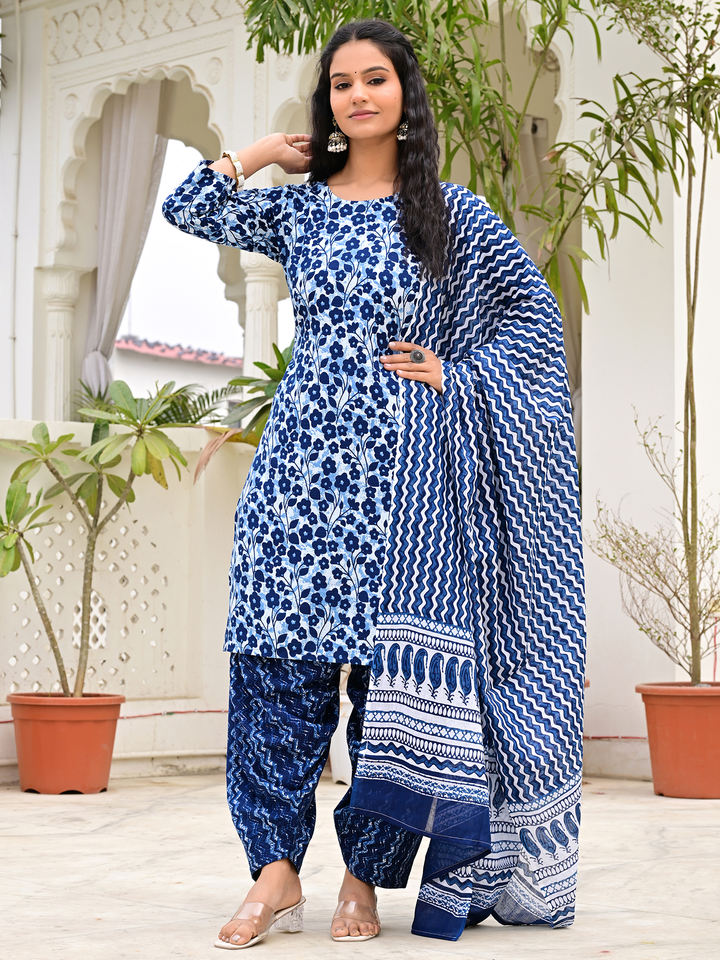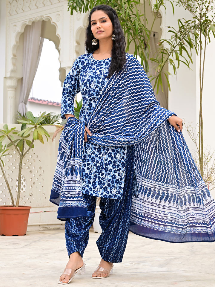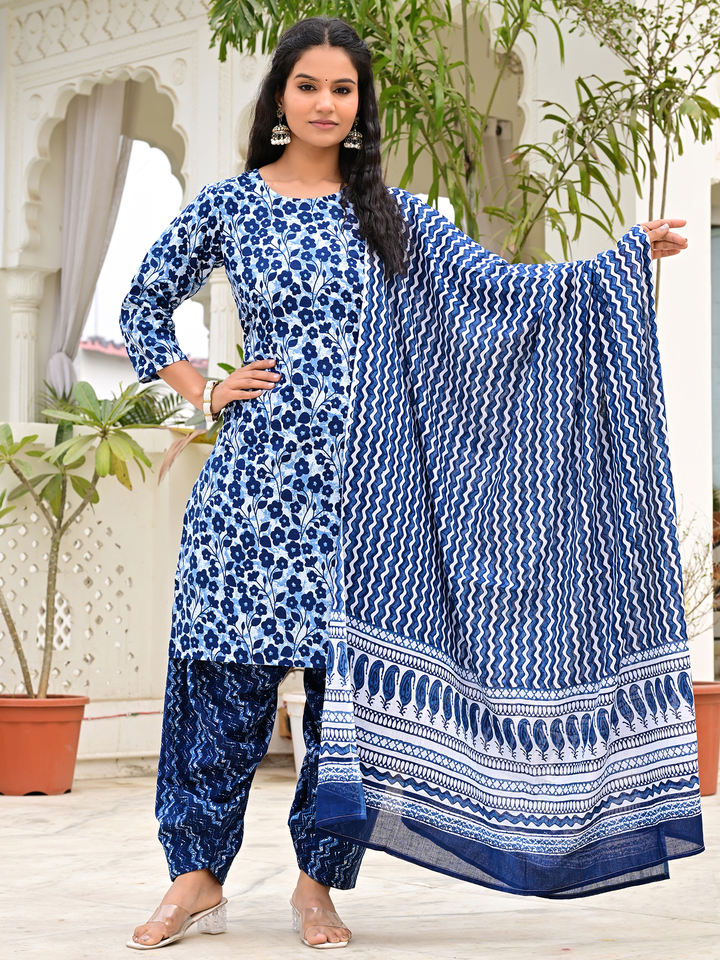 Women Blue Floral Printed Cotton Salwar Kameez Set with Patiala Pant & Dupta Ethnic Summer Party Wear