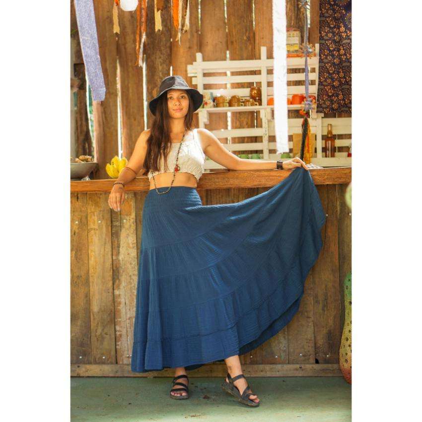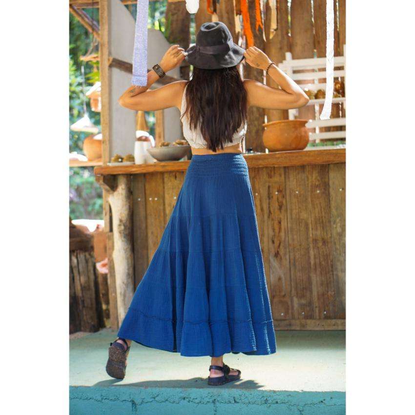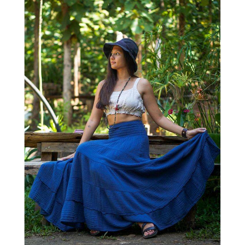 Women Bohemian Two Piece Outfit White Crop Top And High Waist Long Blue Skirt Summer Casual Beach Wear Set