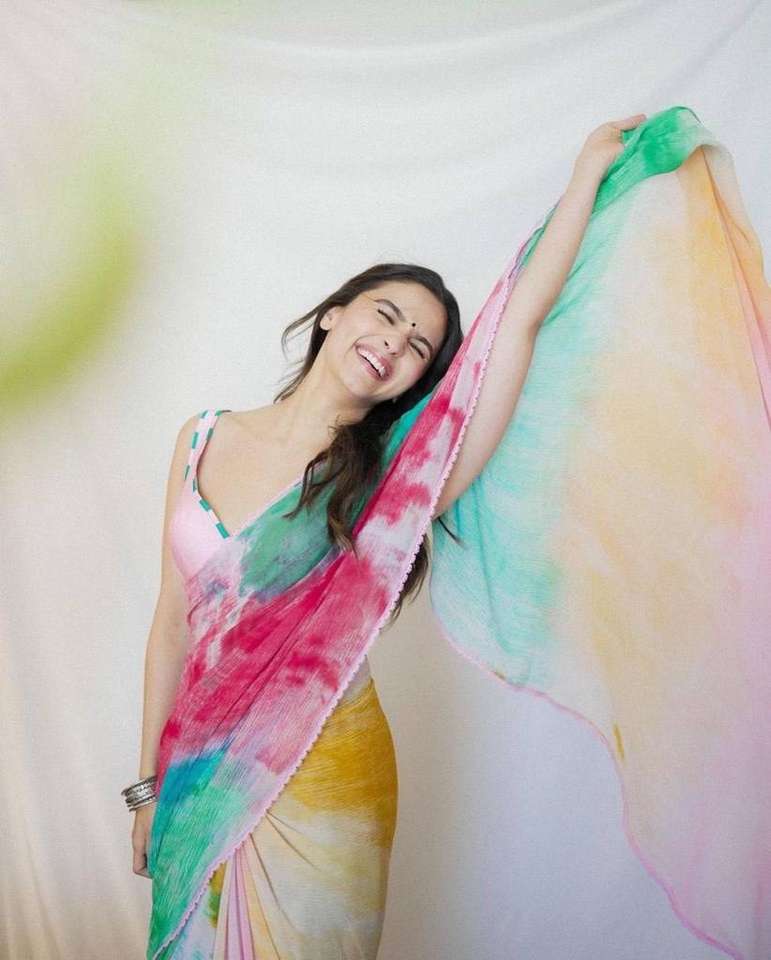 Women Bollywood Style Trending Designer Faux Georgette Printed Saree With Blouse Launch Presenting Alia Bhatt in Tie-dye Saree