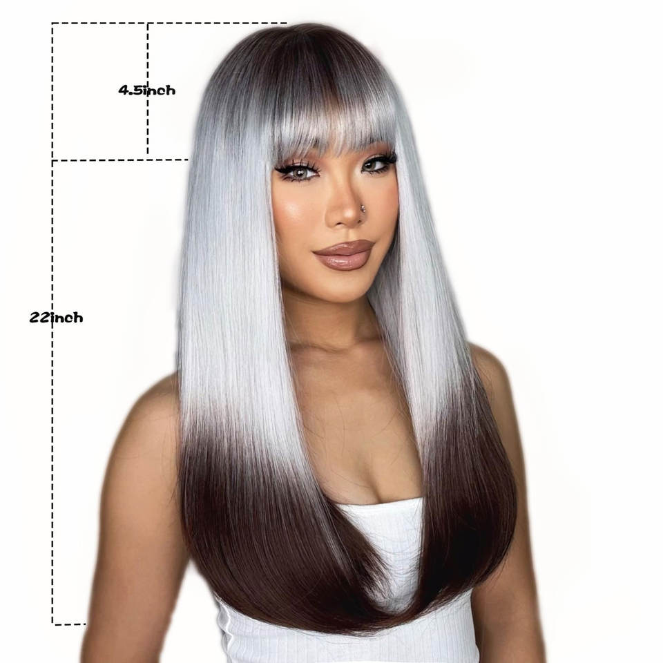 Women Chest-Length Long Straight Half Black White Wig Synthetic Lolita Wig with Bangs Cosplay Party and Halloween Gray Black
