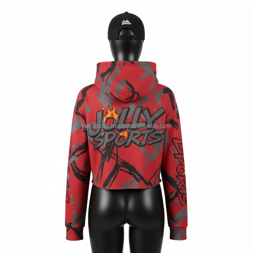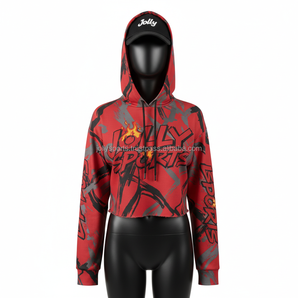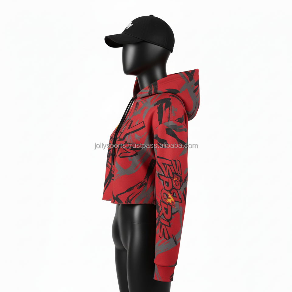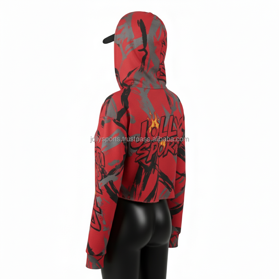 Women Crop Top Hoodie Premium 300 GSM Soft Polyester Blend Fabric Red Allover Print Sublimation Custom Logo Oversize Fit