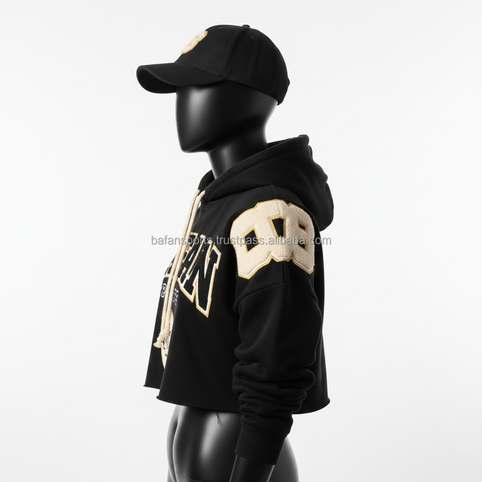 Women Crop Top Hoodie Premium 320 GSM Soft Fleece Black with Beige Shoulder Panels Embroidered Custom Logo Chenille Patch Design