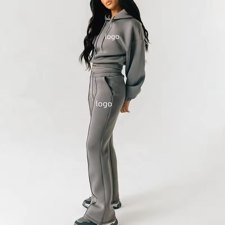 Women Custom Logo Fleece Sweatsuit Set Crop Hoodie Pullover Sweatshirt & Straight Leg Jogger Pants OEM Tracksuit