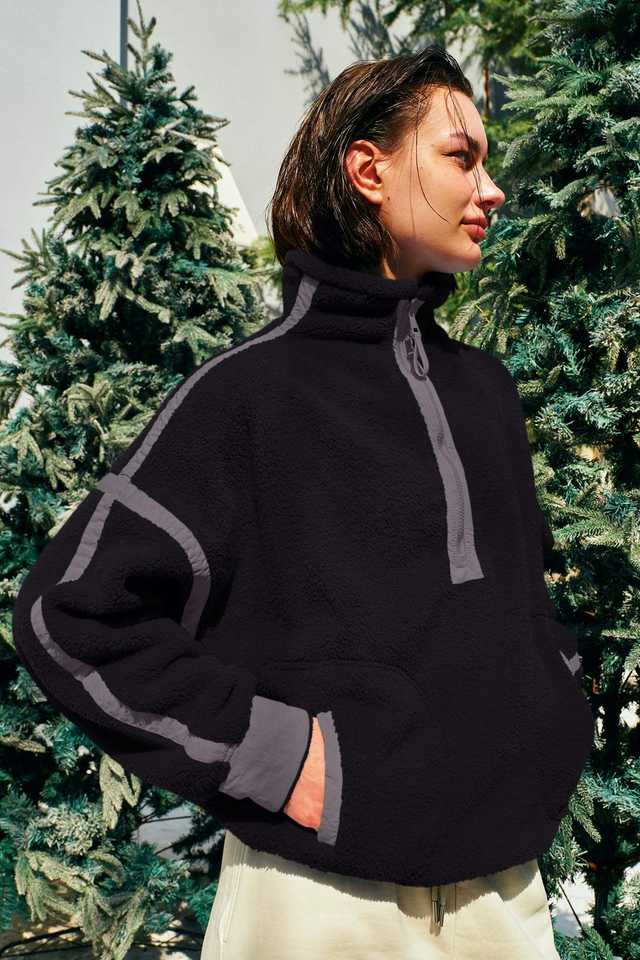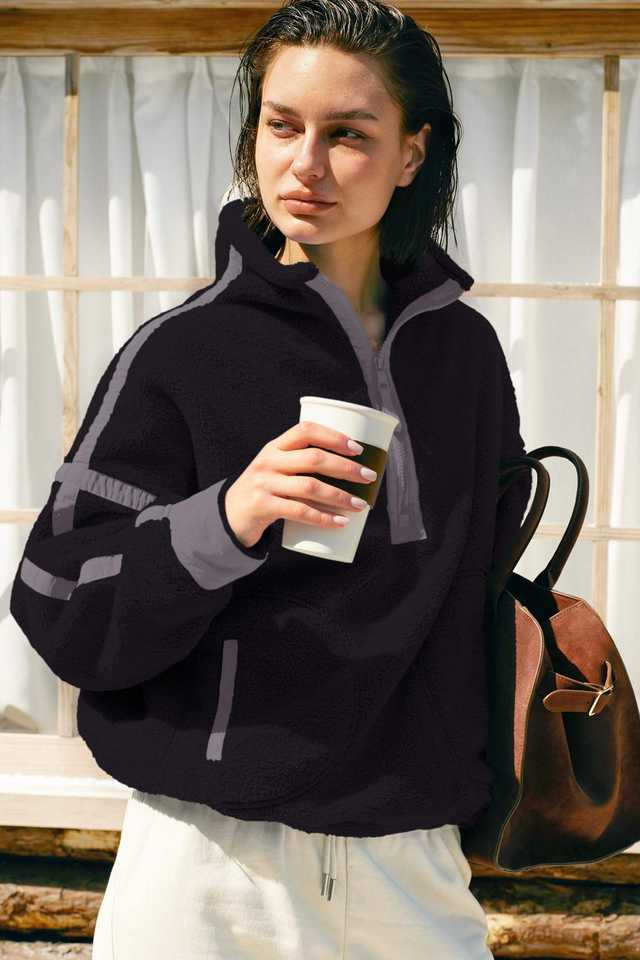 Women Custom Printed Hooded Sherpa Fleece Quarter Zip Sweatshirt Soft Warm Pullover Long Sleeve Contrast Trim Cozy Casual Front