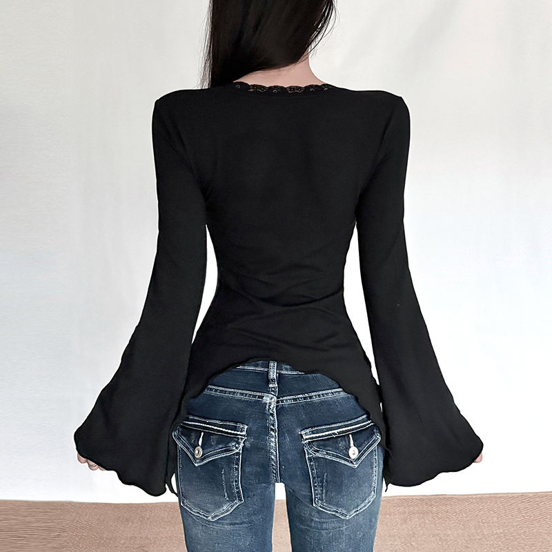 Women Dark Sexy V Neck Lace Patchwork Long Sleeve Top Irregular Hem Flare Sleeve Slim Fit T Shirt