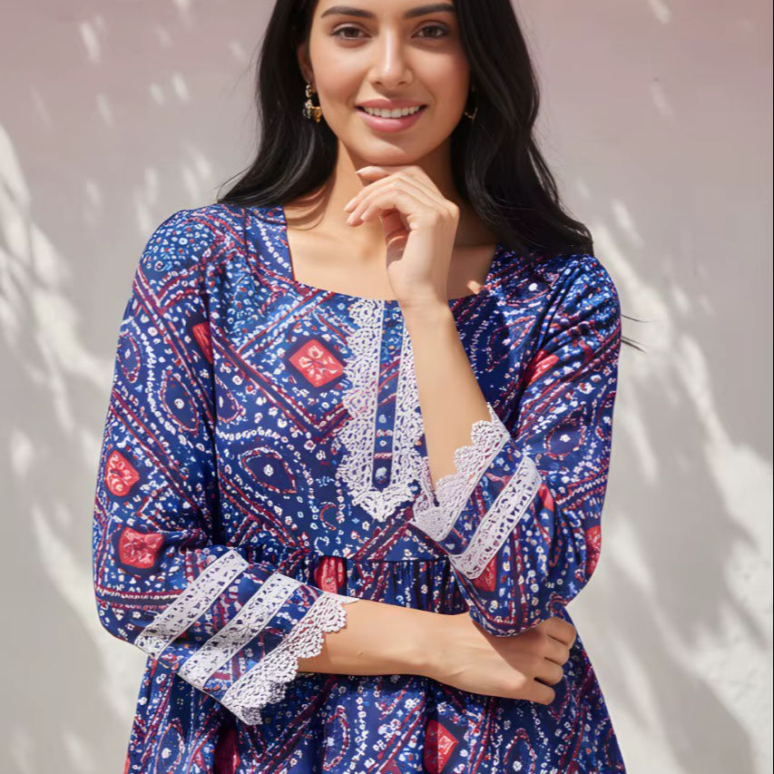 Women Digital Printed Delta Silk Fancy Tunic Regular Length Square Neck Three Quarter Sleeve Fully Stitched Stylish Western Top