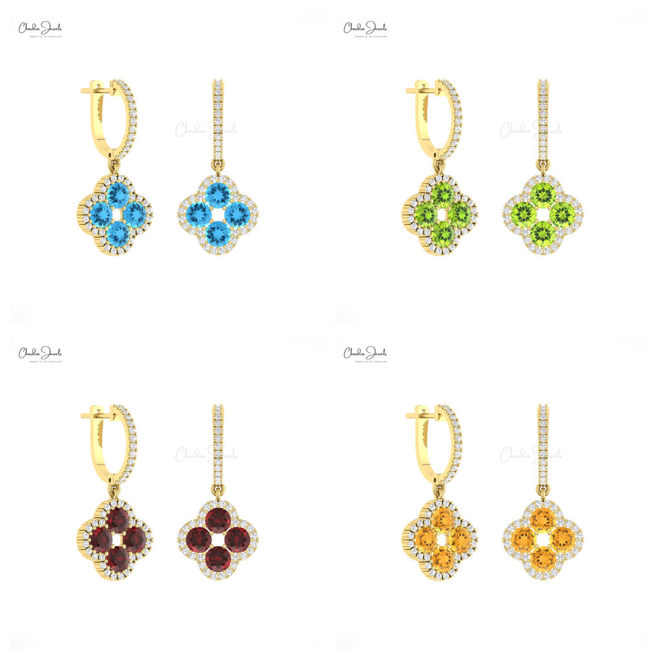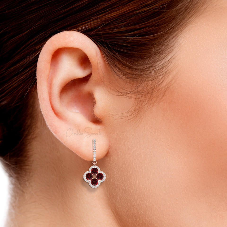 Women Fashion 2025 Natural Garnet 4mm Round Gemstone Clover Halo Earring Real 14k Gold Diamond Danglers Earrings Wholesale India
