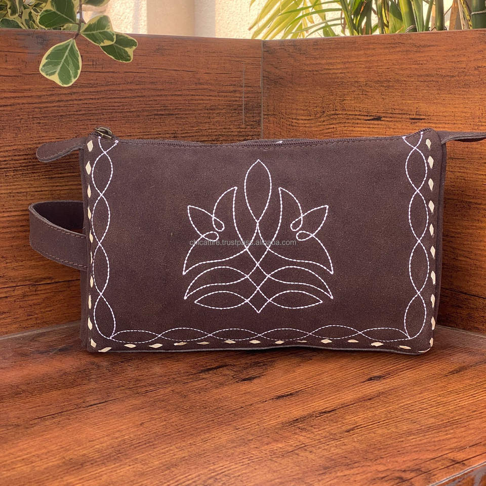 Women Fashion Boot Stitch Genuine Suede Leather Cosmetic Bag & Brown Boot Stitch Suede Leather Portable Small Jewelry Case Sets