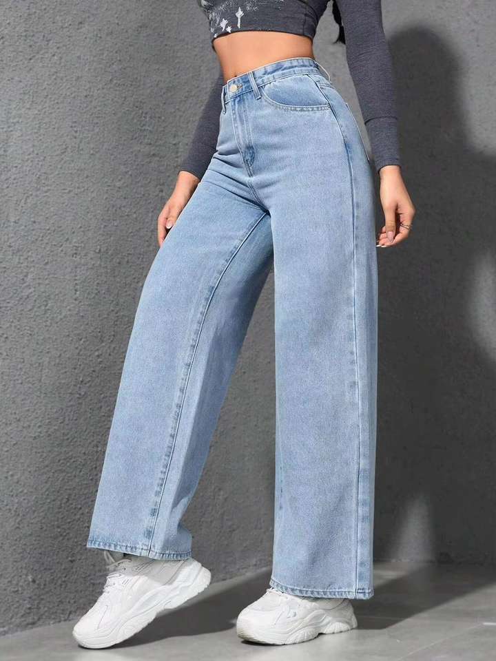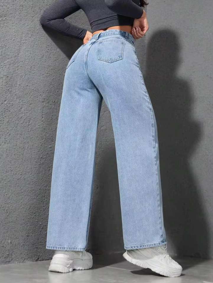 Women Fashion Mid-Rise Wide Leg Jeans Loose Fit Stretch Denim Straight Flare Baggy Jeans with Pockets
