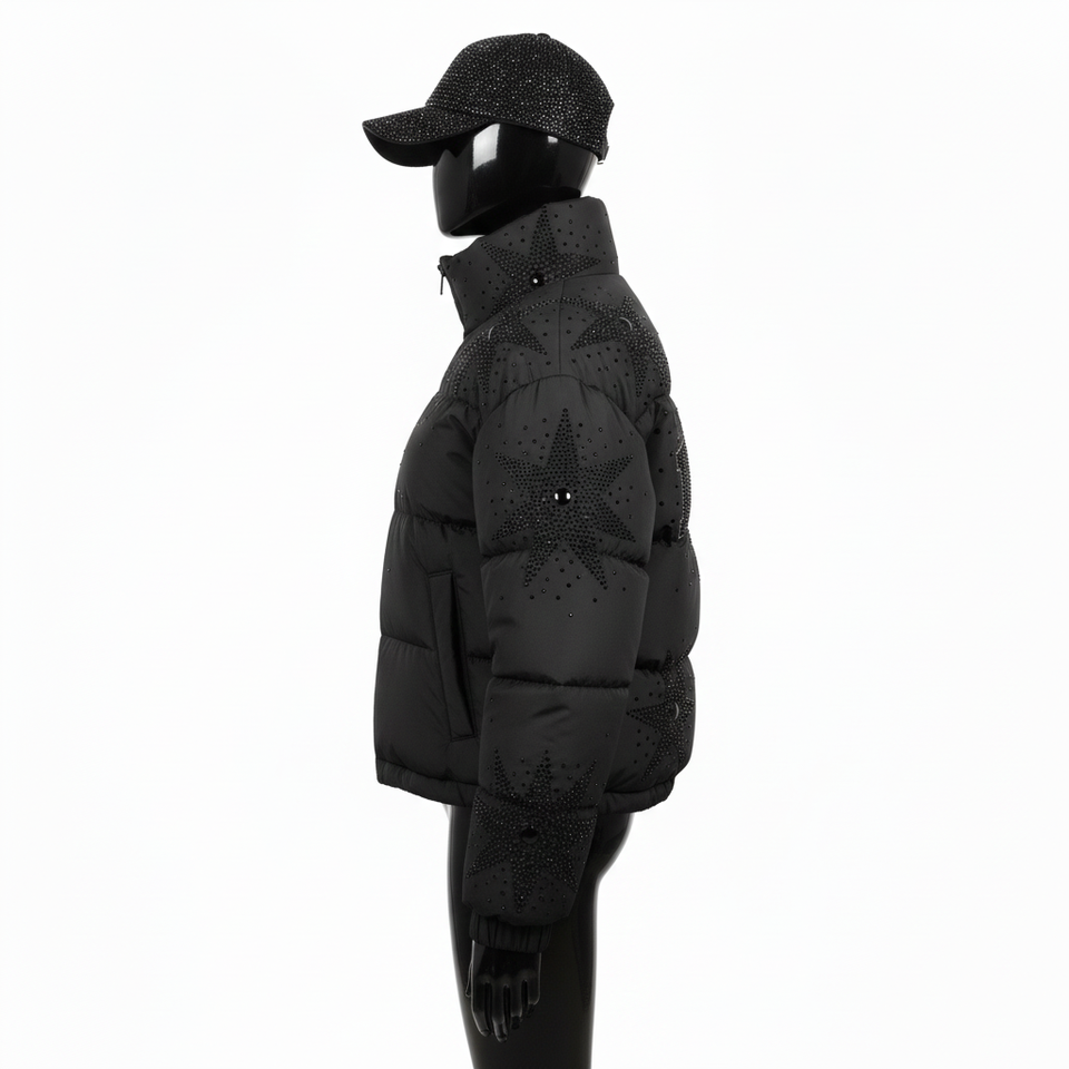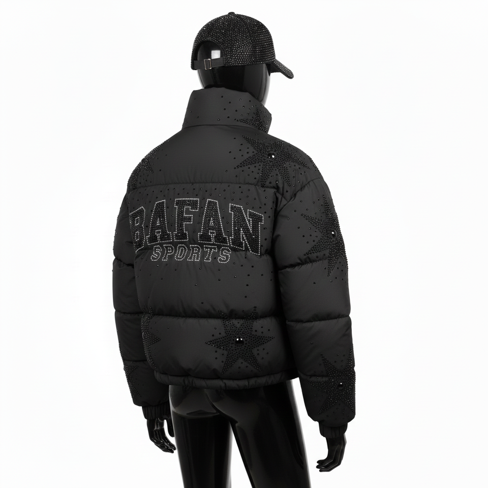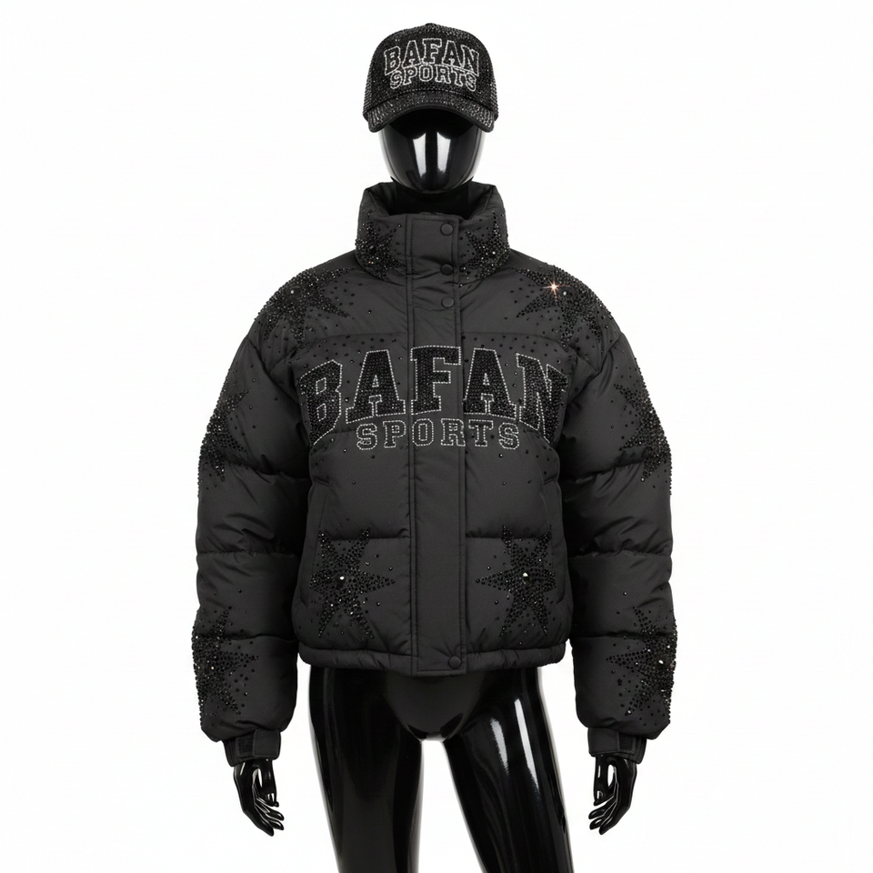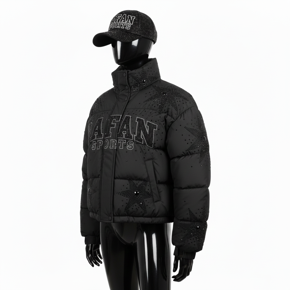Women Fashion Puffer Jacket Soft Matte Polyester Fabric GSM Panel Quilted Style Custom Rhinestone Logo Puffer Jacket for women