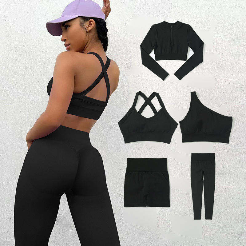 Women Five Piece Activewear Set Black Stretch Sports Bra Crop Top Long Sleeve Top Shorts Leggings Slim Fit Breathable Waist