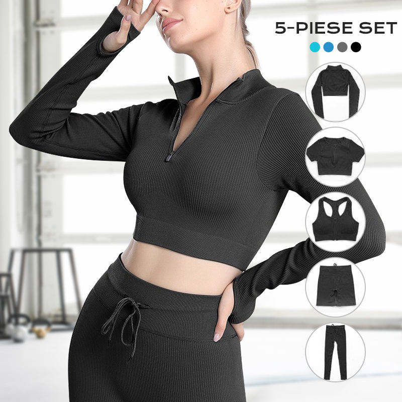 Women Five Piece Solid Recyclable Activewear Set Gym Yoga Fitness Training Outfit Sleeveless Top Long Sleeve Jacket Sports Bra
