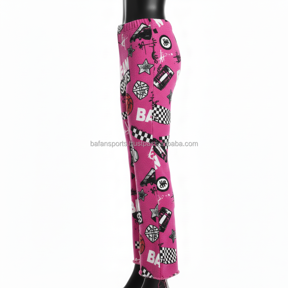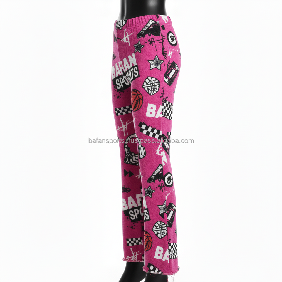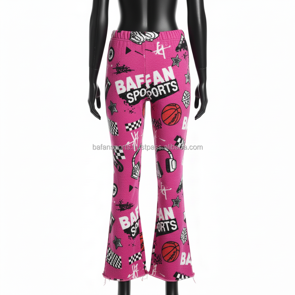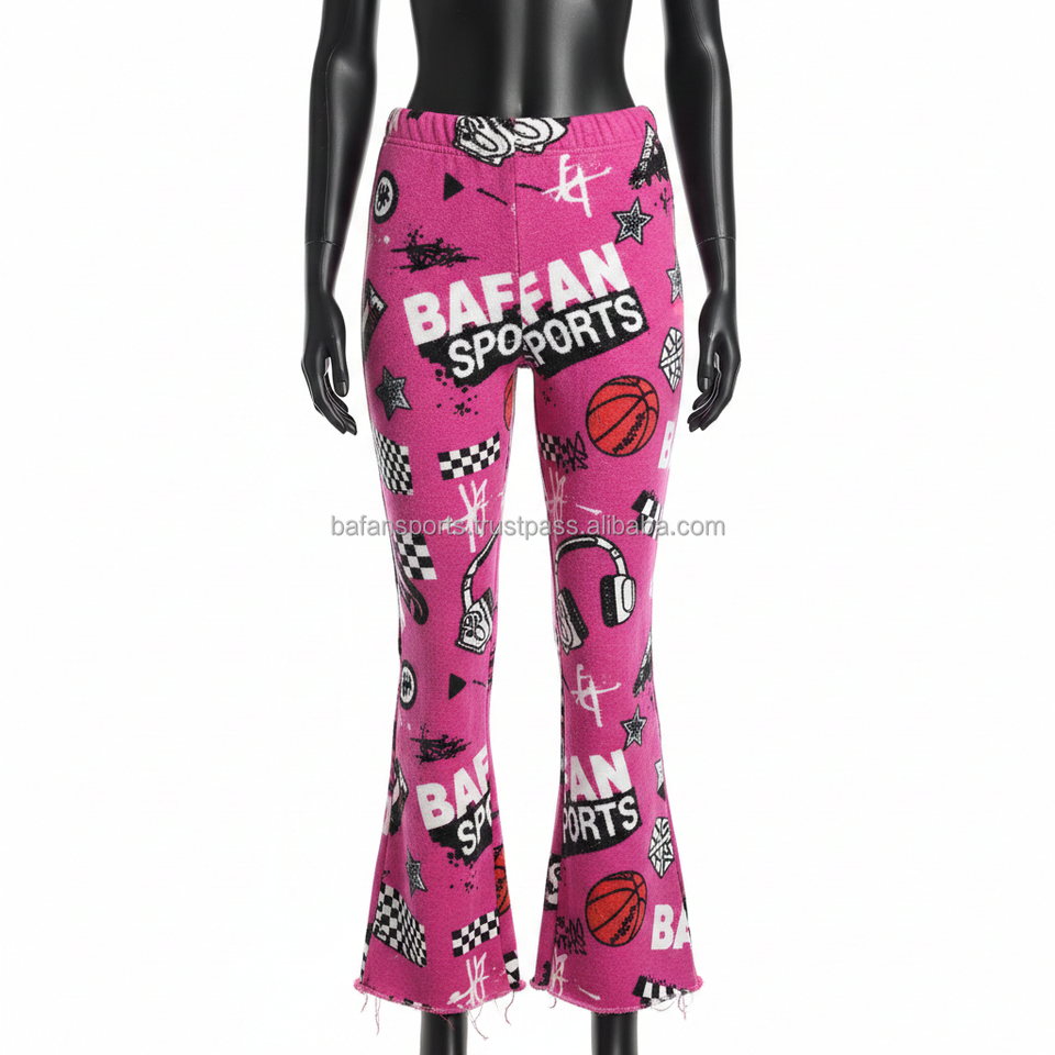 Women Flare Pant Premium GSM Fleece Fabric Pink Sports Print Custom Logo Heat Transfer Trendy Streetwear Style Women Flare Pants