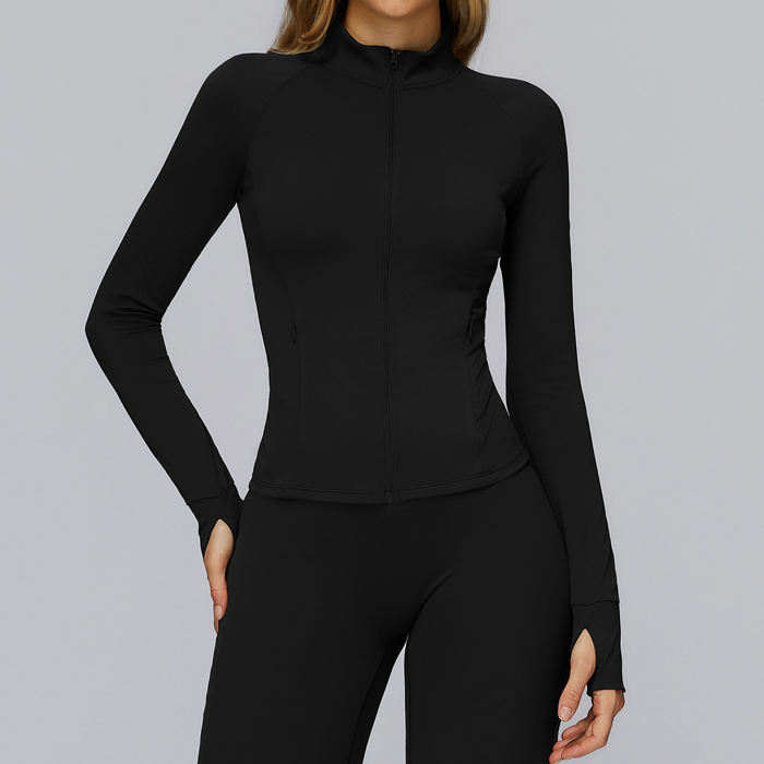 Women Full Zipper Long Sleeve Fitness Workout Running Tights Slim Fit Yoga Gym Wear Top Sports Jacket With Thumb Hole Zip Pocket