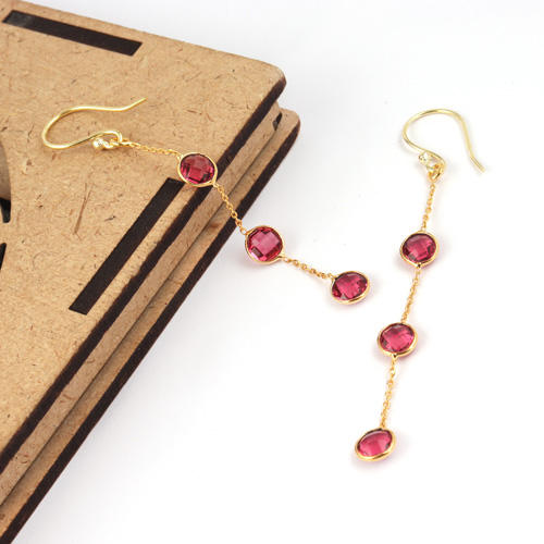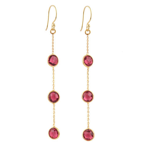 Women Gift Jewelry Dainty Three Stone Red Quartz Hanging Hook Style Earring Brass Gold Plated Bezel Setting Chain Style Earrings
