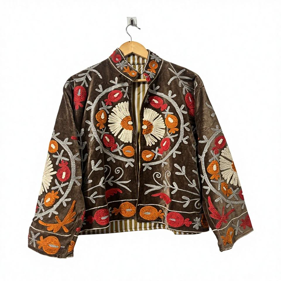 Women Handmade Knitted Velvet Embroidered Floral Folk Bomber Jacket Luxury Ethnic Boho Winter Breathable Outerwear Export