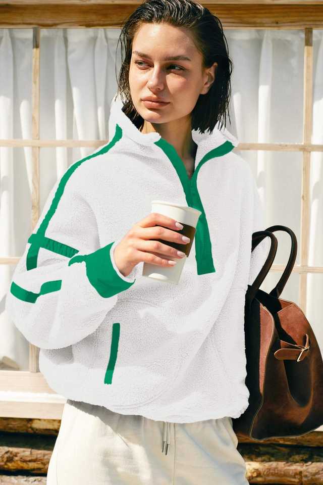 Women Hooded Sherpa Fleece Quarter Zip Pullover Sweatshirt Soft Warm Long Sleeve Contrast Trim Cozy Casual Top Comfy Winter Wear
