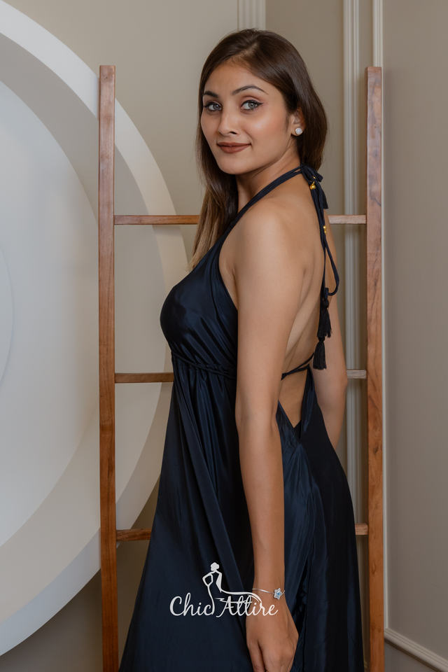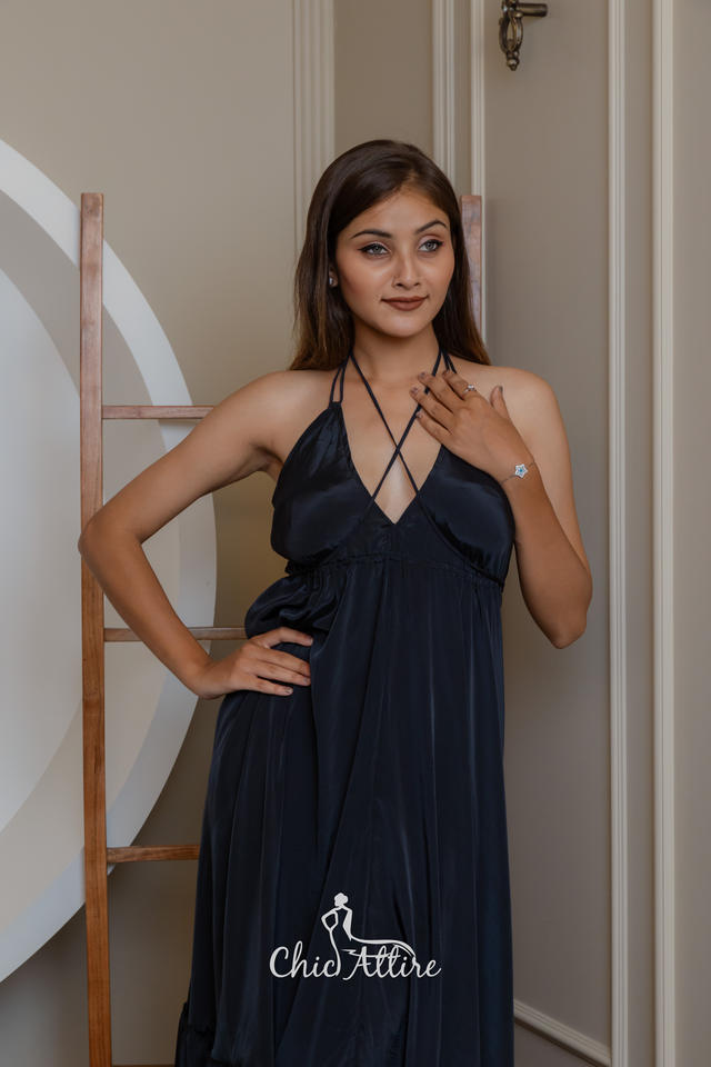 Women Hot Selling Summer Wear Navy Blue Silk Maxi Long Beach Wear Dress Boho Exclusive Designer Halter Neck Evening Party Dress
